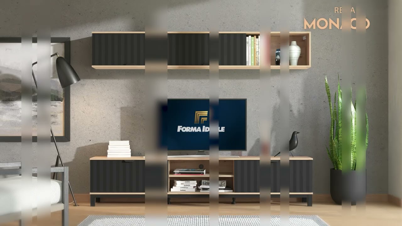 Regal MONACO, u kombinaciji dekora artisan hrasta, artisan hrasta sa prugama, crne mat folije i crnog dekora dizajniran je da zadovolji funkcionalne i estetske zahteve u uređenju ambijenta dnevnog boravka. Regal MONACO omogućava praktično opremanje dnevnog boravka, zahvaljujući upotrebnom prostoru koji čine kako otvorene, tako i zatvorene police za odlaganje, kao i prostor predviđen za TV uređaj i ostalu audio-vizuelnu opremu.
