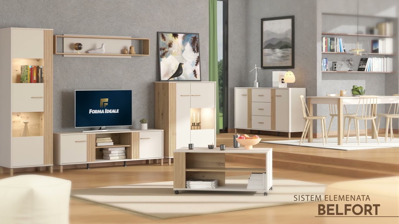 Sistem elemenata BELFORT za opremanje dnevnog boravka predstavlja moderno rešenje za stilizovanje ambijenta doma. Kombinacija dekora artisan hrasta, kašmira i artisan hrast folije donosi u prostor notu elegancije i ambijentalne topline i sa sofisticiranim stilskim izrazom koji je potreban savremenim enterijerima. Sistem elemenata BELFORT se sastoji od 7 elemenata koji su kompletno rešenje za opremanje dnevne sobe, i to su: Vitrina BELFORT 1K VS1, Vitrina BELFORT 2K VS1, TV polica BELFORT 3K2V, Komoda BELFORT 3K3F, Zidna polica BELFORT ZP. Sistemu elemenata pripada i trpezarijski sto BELFORT 160x80 (sa mogućnošću razvlačenja za dodatnih 40 cm), koji je funkcionalni dodatak za otvorene prostore, a što doprinosi ujednačenoj dizajnerskoj liniji dnevne sobe i trpezarije.