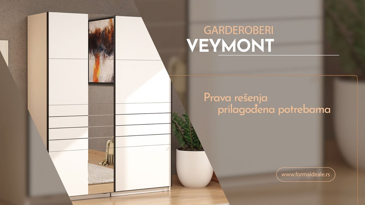 Kolekcija garderobera VEYMONT predstavlja elegantno i veoma atraktivno dizajnersko rešenje, čija izražena estetika doprinosi celokupnom ambijentalnom utisku. Predstavljeno je pet modela garderobera VEYMONT, različitih dimenzija širine, u opak belom i artisan hrast dekoru. Svi modeli poseduju ogledalo na jednom od frontova. U osnovnoj formi garderoberi VEYMONT poseduju samo garderobne šipke za odlaganje viseće garderobe, zbog čega su predstavljeni dodatni setovi polica, ukoliko postoji potreba za drugačijim načinom odlaganja.