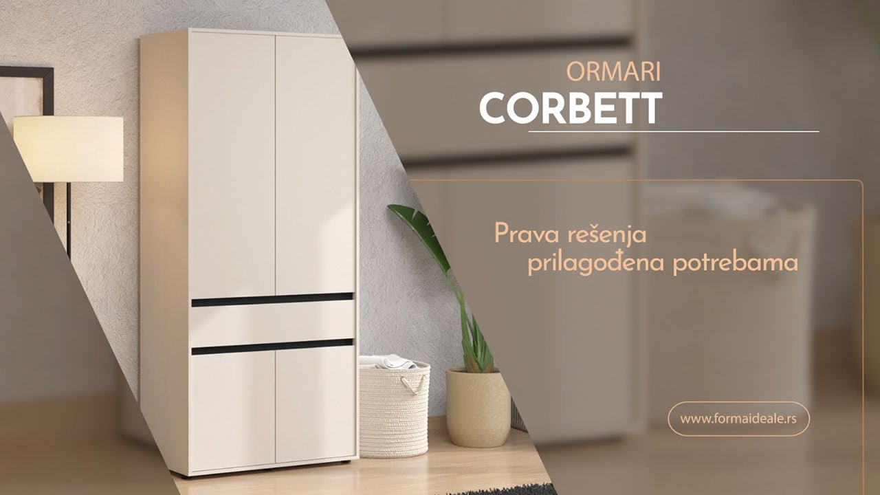 Kolekciju ormara CORBETT čine četiri različita modela u dve kombinacije dekora – artisan hrast i crna mat folije, kao i kašmiri crna mat folija. Sva četiri modela ormara CORBETT odlikuje drugačiji raspored upotrebnog prostora koji čine delovi sa garderobnim šipkama, policama, kao i deo sa fiokama. Svi modeli poseduju ogledalo koje ne samo da ima upotrebnu, već i estetsku vrednost.